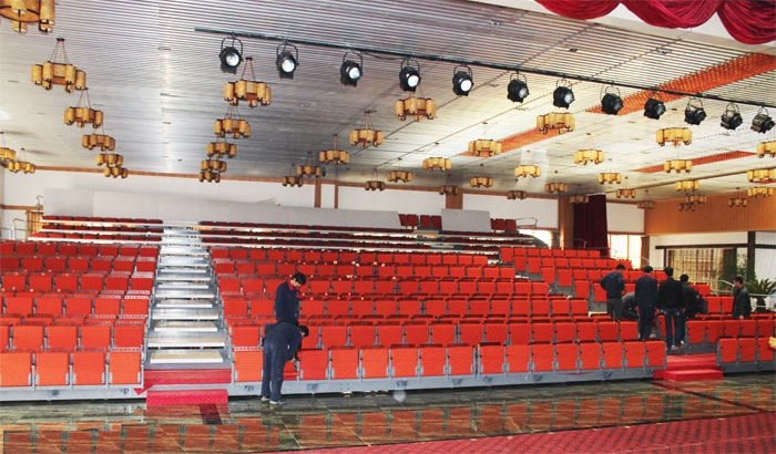 设有自动伸缩式阶梯座椅700个, LED大显示屏、高分贝音响及活动舞台。